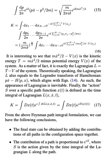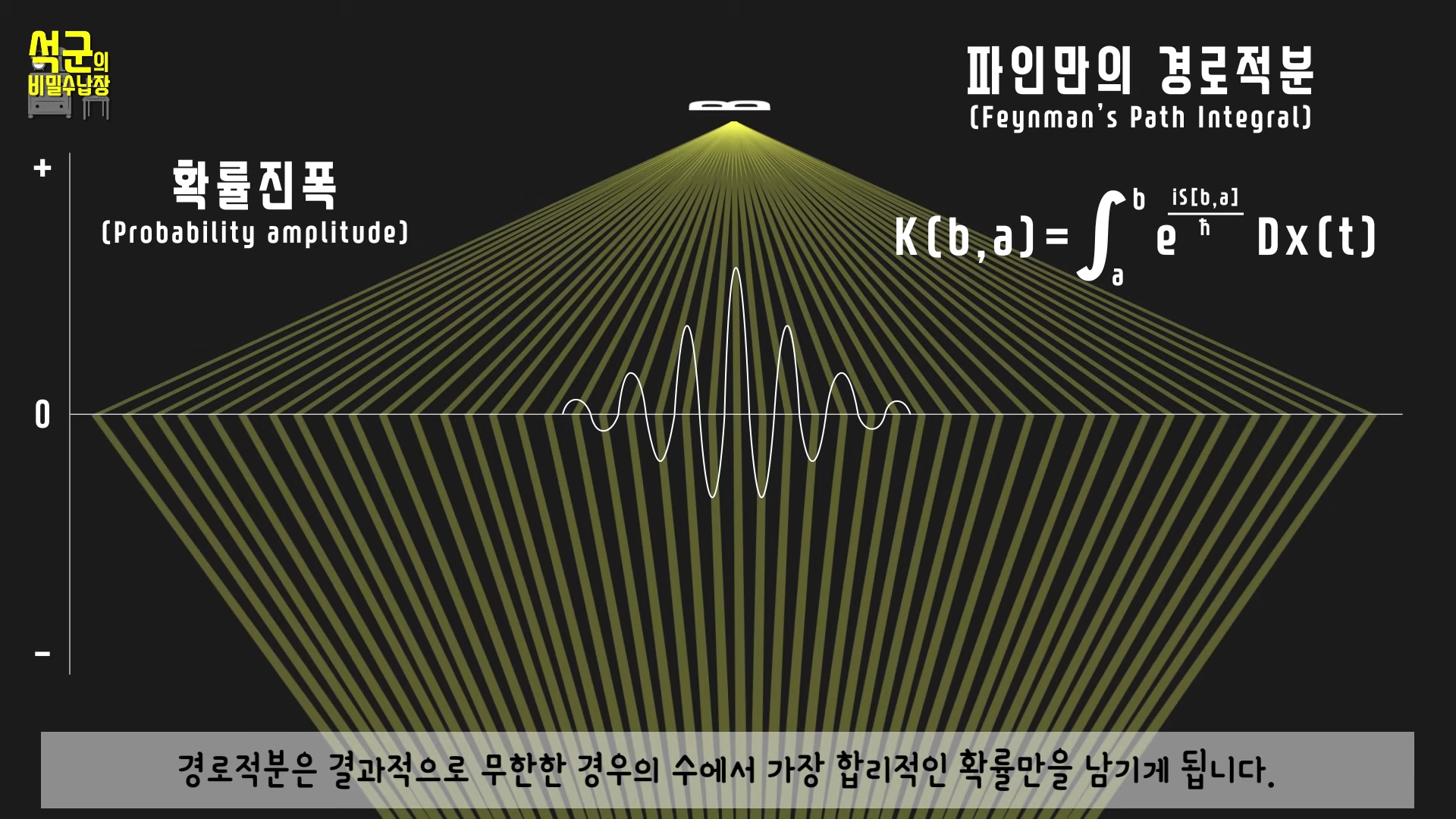 라그랑지앙 L 을 시간에 대해서 적분한 것이 S 라고 할 때, e^iS 에 비례하는 형태로 경로의 기여도 가 나온다
