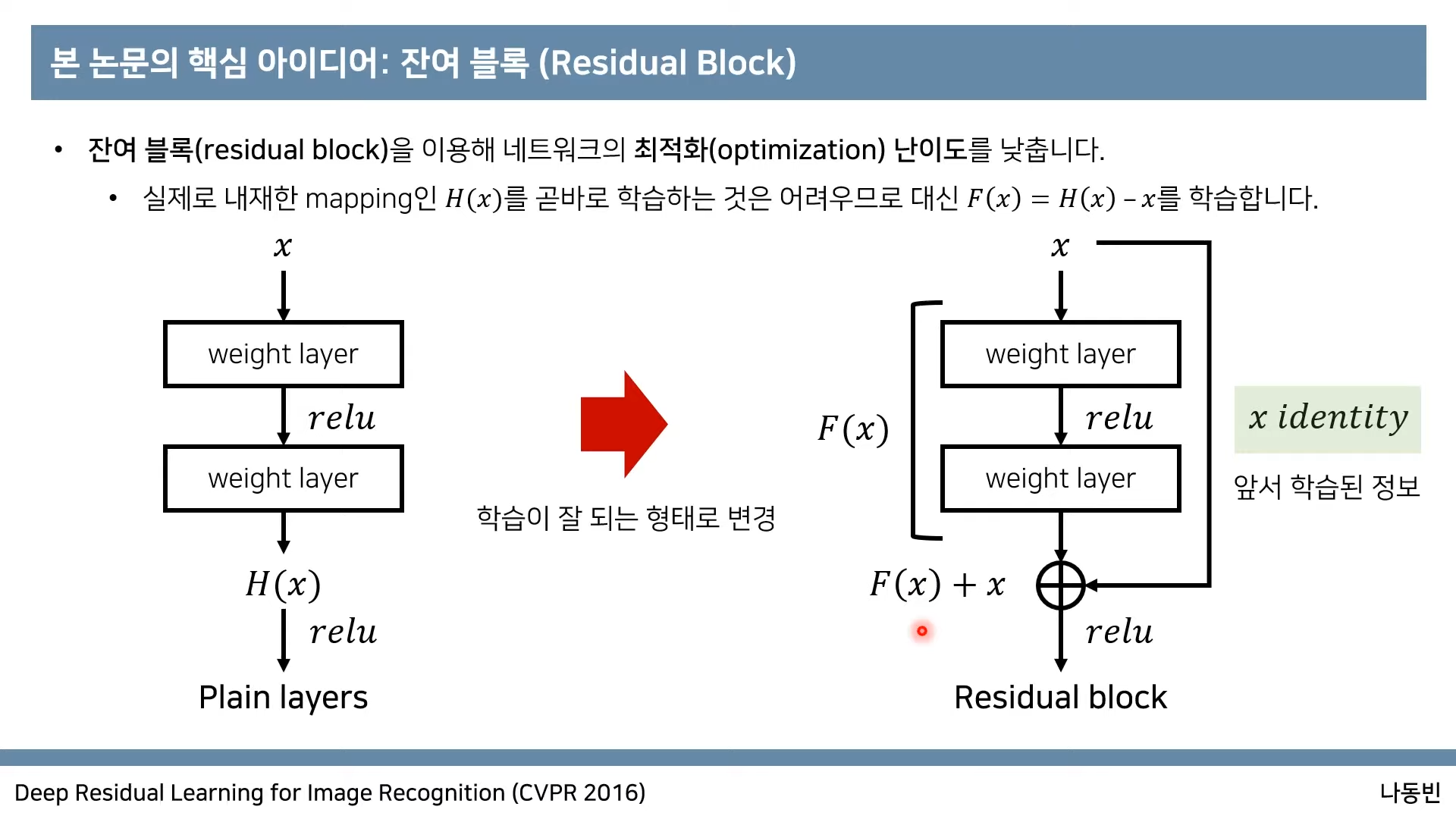 F(x)를 학습하는게 더 쉽다 ( H(x) 대신 F(x) + x 를 출력으로,,,, 즉 F(x) 는 H(x) -x 이며 이것을 fit 한다. )