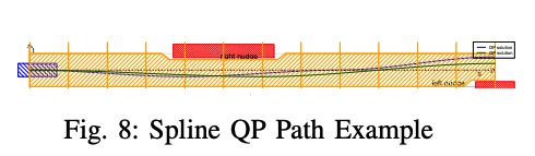 그런 다음 스플라인 기반 QP 단계는 그림 8 과 같이 이 가능한 터널(feasible tunnel) 내에서 부드러운 경로를 생성합니다.