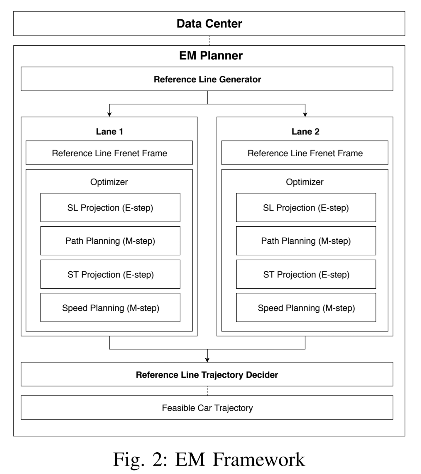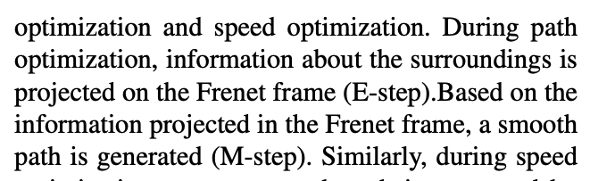 그리고 자전거로인한 갑작스러운 경로불안정 문제도 고려대상이다.(1) 시스템의 최상위 계층은 병렬로 계산된 차선 수준 궤적을 비교하여 차선 변경 시나리오를 처리하는 다중 차선 전략입니다. (2) 레인 레벨 궤적 생성기 내부에서 Frenet 프레임을 기반으로 경로 및 속도 최적화를 반복적으로 해결합니다.