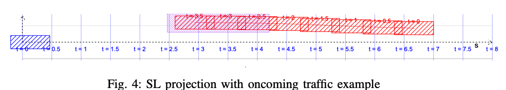 그러면 각 시점에서 dynamic 장애물과 ego 카의 중첩이 Frenet 프레임에 매핑됩니다.