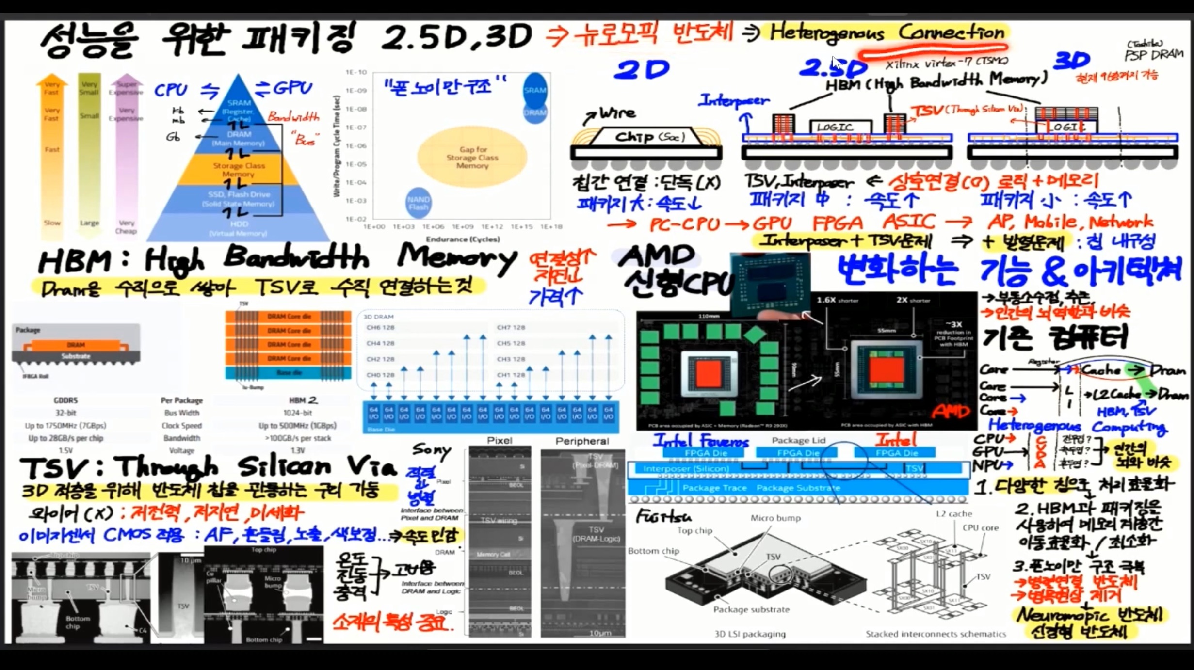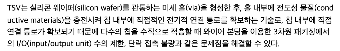 로직 칩과 메모리 칩을 가깝게 연결, interposer라는 실리콘에 구멍을 뚫어 그 안에 전도성 물질로 채워넣어