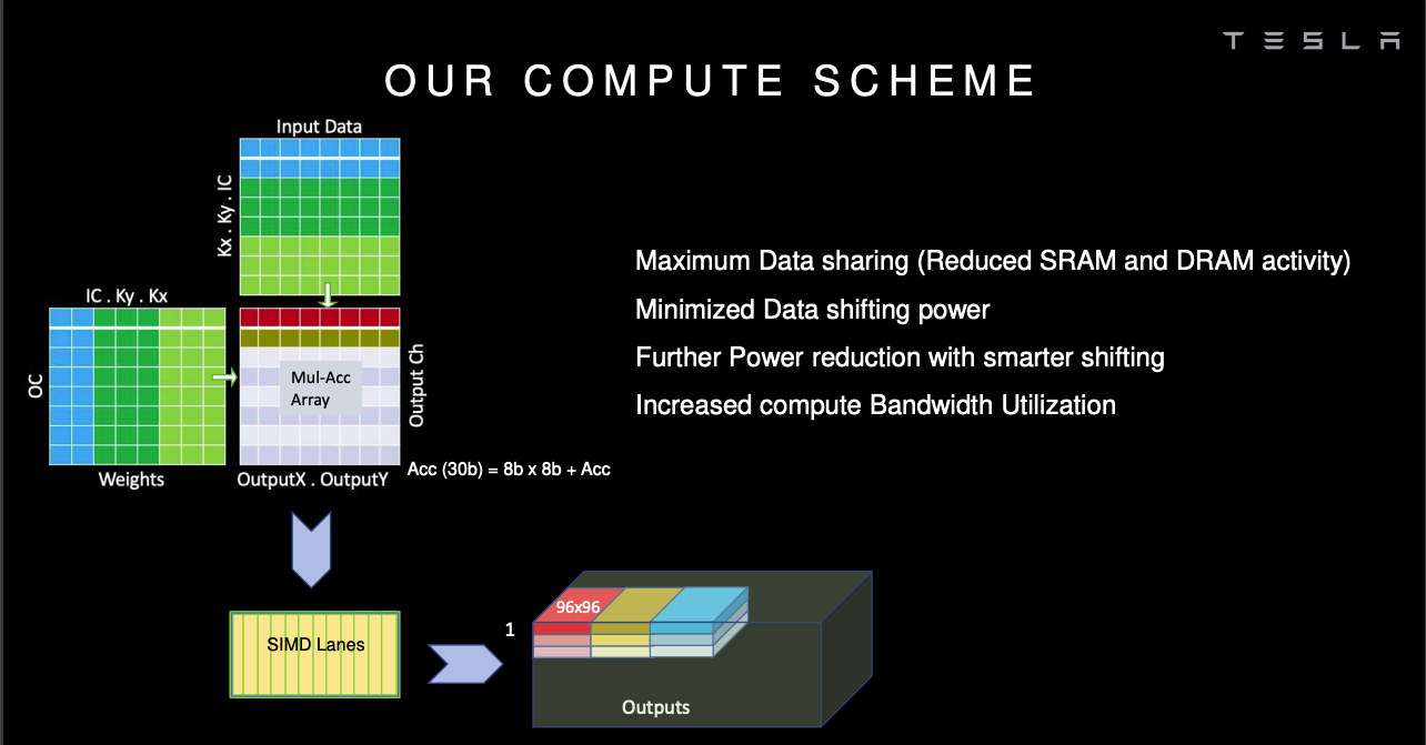 With the optimizations mentioned above, the MAC array operations are simplified. Each array comprises 9,216 MACs and is arranged in a 96 by 96 cells of independent single-cycle MAC feedback loops (note that this is not a systolic array, there is no data shifting inter-cells). In order to simplify their design and reduce the power, their MACs comprise 8-bit by 8-bit integer multiply and a 32-bit integer addition. Tesla’s own models are all pre-quantized when they are sent to customers, so the chips just store all the data and weights in 8-bit integers.