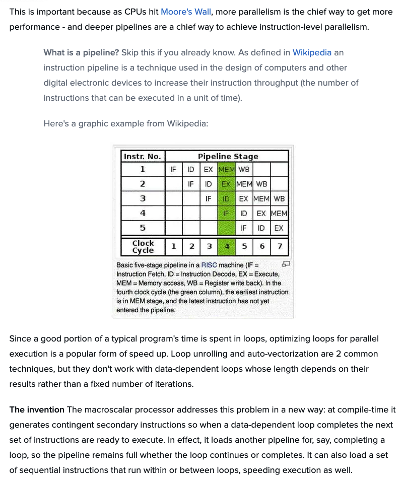 " 매크로스칼라 프로세서는 새로운 방식으로 이 문제를 해결합니다. 컴파일 타임에 데이터 종속 루프가 완료될 때 다음 명령어 세트를 실행할 준비가 되도록 조건부 보조 명령어를 생성합니다. 실제로 루프를 완료하기 위해 다른 파이프라인을 로드하므로 루프가 계속되거나 완료되더라도 파이프라인은 가득 찬 상태를 유지합니다. 또한 루프 내에서 또는 루프 사이에서 실행되는 일련의 순차적 명령을 로드하여 실행 속도도 높일 수 있습니다. "