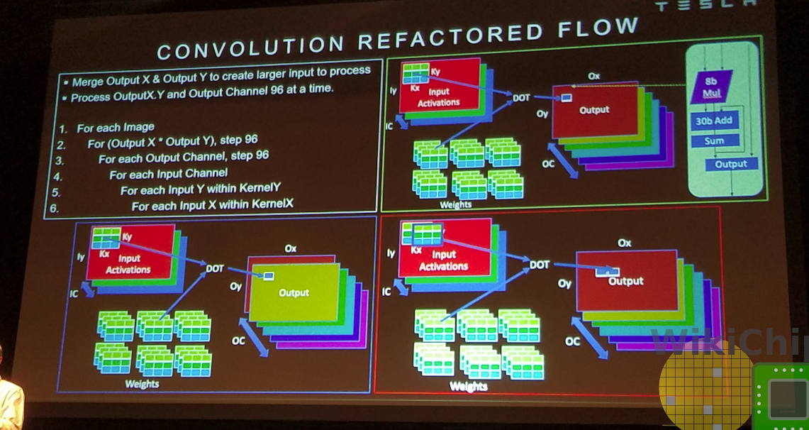Tesla는 여기에서 여러 가지 다른 최적화를 수행합니다. NPU는 출력 채널 내에서 X 및 Y 차원의 출력 픽셀을 병합하여 여러 출력 채널에서 병렬로 작동합니다. 이를 통해 작업을 병렬화하고 동시에 96픽셀에서 작동할 수 있습니다. 즉, 한 채널의 모든 픽셀에서 일할 때, 모든 입력 가중치가 공유됩니다. 또한 출력 채널과 입력 채널 루프도 교환합니다(아래 사진의 코드 부분 참조). 이를 통해 모든 출력 채널에서 순차적으로 작업하여 추가 데이터 이동 없이 모든 입력 활성화를 공유할 수 있습니다. 대역폭 요구 사항의 또 다른 멋진 감소입니다.