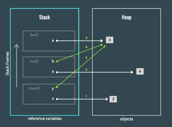 스택 이벤트의 시퀀스 아래에서 볼 수 있듯이 함수는 호출(스택에 푸시됨)되고 반환(스택에서 팝)되며 힙에 개체를 할당합니다. a = 10