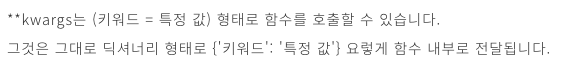 따라서 **kwargs 가 맨 오른쪽에 오게 된다.