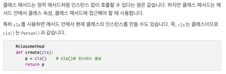 메서드 안에서!! 특히 cls를 사용하면 메서드 안에서 현재 클래스의 인스턴스를 만들 수도 있습니다.