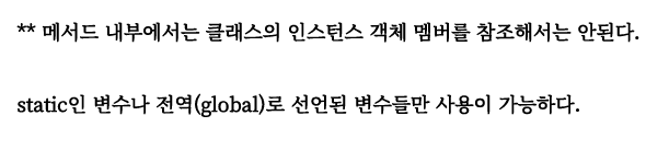 클래스에서 바로 호출하면 메모리의 높은 주소인 스택에서 접근이 쉬워진다.정적 메서드나 클래스 메서드는 프로그램 전체 영역에서 접근 가능한 만큼 예전 전역변수들과 비슷한 특성을 가지고 있다. 그러다 보니 남발하는 것은 권장하지 않는다.
