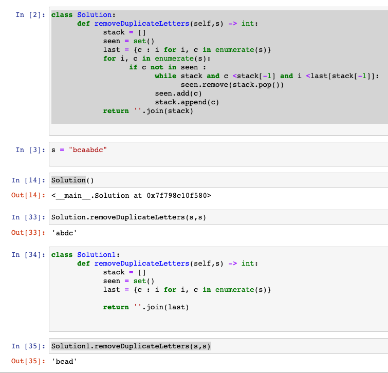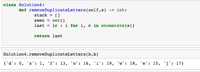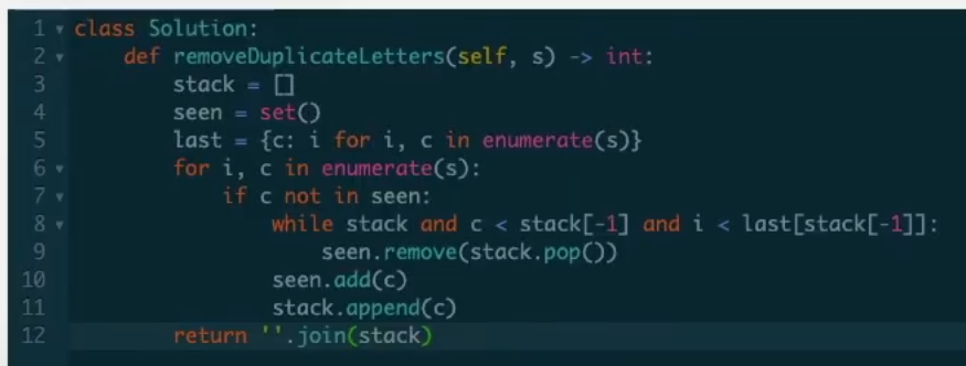 def removeDuplicateLetters(self, s:str) -> str: #집합으로 정렬 for char in sorted(set(s)): suffix = s[s.index(char):] #전체 집합과 접미사 집합이 일치할 때 분리 진행 if set(s) == set(suffixx): return char + self.removeDuplicateLetters(suffix.replace(char, '')) return ''set 은 고유값 얻을 때사용