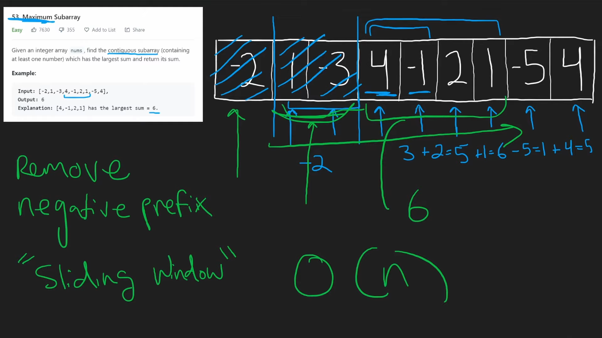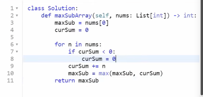 class Solution: def maxSubArray(self, nums: List[int]) -> int: # brute force if len(nums) == 1: answer = nums[0] return answer for list_len in range(1, len(nums)+1): for index in range(0, len(nums)-list_len+1): temp = sum(nums[index:index+list_len]) answer = max(temp, answer) return answer