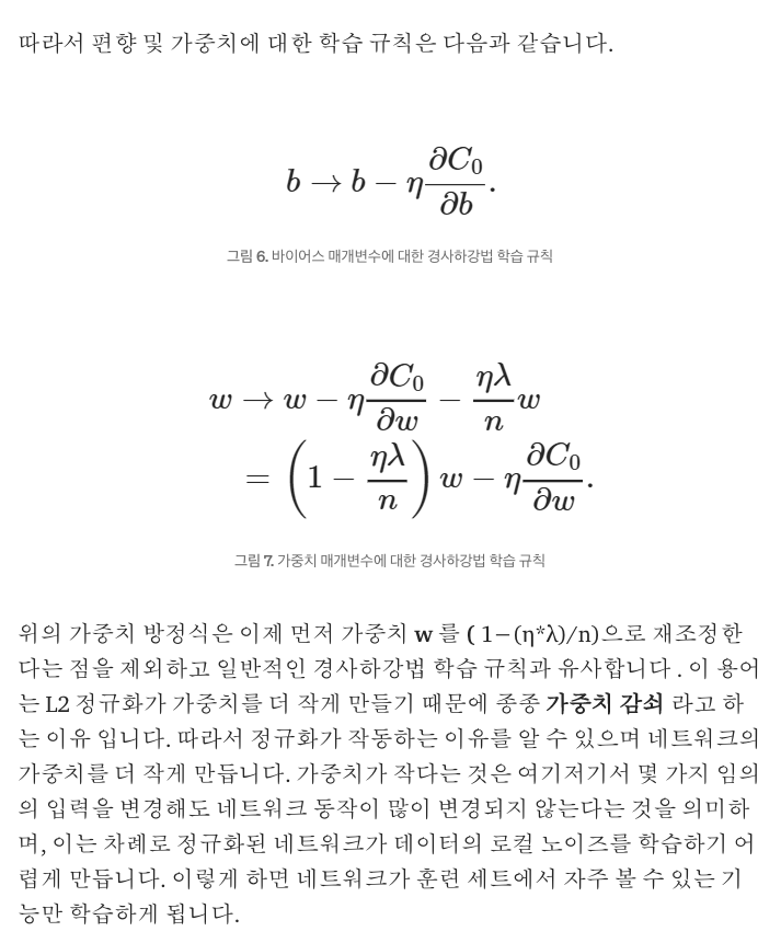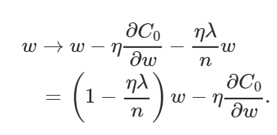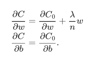 편향 매개변수의 부분 유도는 정규화 항이 적용되지 않으므로 변경되지 않으며 가중치 매개변수는 추가 ((λ/n)*w) 정규화 항을 포함합니다.따라서 편향 및 가중치에 대한 학습 규칙은 다음과 같습니다.