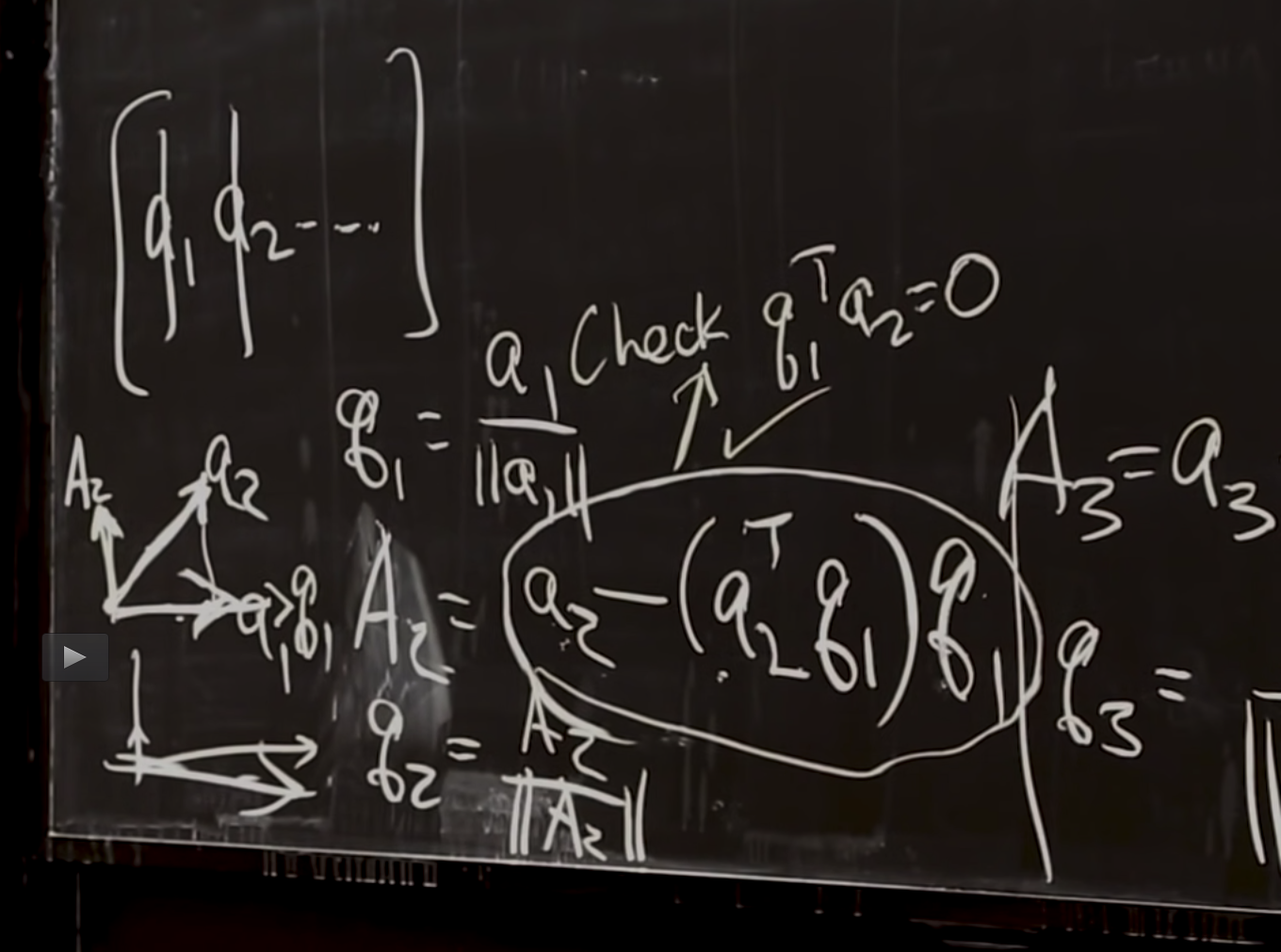 So let me just write down what you have to do in a different order. So this is now with column pivoting, column exchange, column pivoting allowed, or it's possible. So to make it possible, I have to find not only A2, the piece of little a2, I have to find a2, the piece. I'm just going to copy that. I have to take my second column, subtract off the q1 part. And that could be small. So I have to compare it with-- oh, I haven't written this page up. So I haven't got a notation in mind yet. I won't give it a name. I have to also compute at this step before deciding q2-- now I'm describing how to decide q2, the second vector. And I'm saying that the way to decide q2 is not only to take a piece of a2 but also the piece of a3. Look at this piece. And look at all the other pieces.