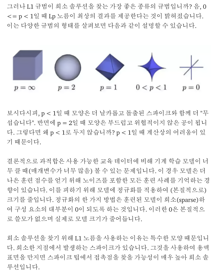 So far we have demonstrated why sparsity can avoid over-fitting. But why adding an L1 norm to the loss function and forcing the L1 norm of the solution to be small can produce sparsity?--> 뾰족함 정도로 직관적으로 해석