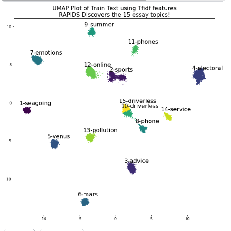 text_embeddings = tfidf.fit_transform( train_text_df.text ).toarray() #텍스트만 추려내서 fit 한 다음 array 로 바꾸기 (임베딩 # 만드는 과정)from cuml import UMAP