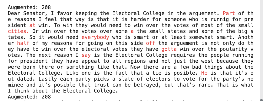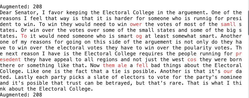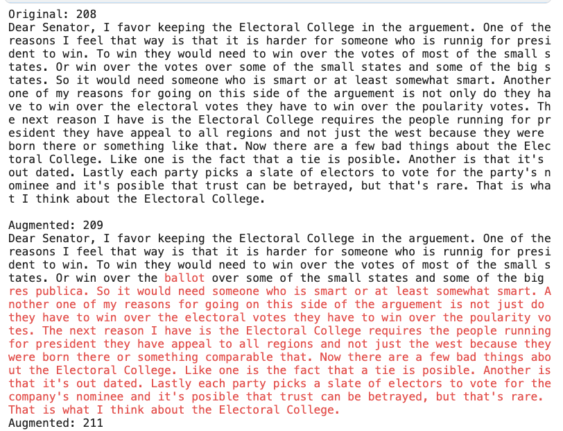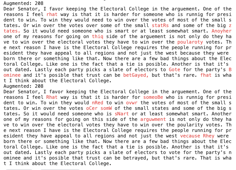 # Install and import nlpaug package. !cp -r ../input/nlpaug-from-github/nlpaug-master ./ !pip install nlpaug-master/ !rm -r nlpaug-master import nlpaug.augmenter.char as nac import nlpaug.augmenter.word as naw import nlpaug.augmenter.word.context_word_embs as nawcwe import nlpaug.augmenter.word.word_embs as nawwe import nlpaug.augmenter.word.spelling as nawsfrom colorama import Fore from pathlib import Path # Set some seeds. We want randomness for real usage, but for this tutorial, determinism helps explain some examples. import numpy as np np.random.seed(1000) import random random.seed(1000) base_path = Path("../input/feedback-prize-2021/train") with open(base_path / "3FF2F530D590.txt") as f: sample = f.read() print(f"Original: {len(sample)}\n{sample}") aug = nac.KeyboardAug() augmented_text = aug.augment(sample) print(f"\nKeyboard augmentation: {len(augmented_text)}\n{augmented_text}")# Replace orig text, with a version that has extra whitespace removed. sample = " ".join([x.strip() for x in sample.split()])def print_and_highlight_diff(orig_text, new_texts): """ A simple diff viewer for augmented texts. """ orig_split = orig_text.split() print(f"Original: {len(orig_split)}\n{orig_text}\n") for new_text in new_texts: print(f"Augmented: {len(new_text.split())}") for i, word in enumerate(new_text.split()): if i < len(orig_split) and word == orig_split[i]: print(word, end=" ") else: print(Fore.RED + word + Fore.RESET, end=" ") print()word 마다 한개의 캐릭터를 증강